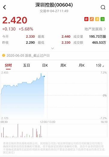 智通财经PP获悉,深圳控股(00604)公布,2020年1-3月份,集团总合同销售额约人民币25.71亿元,较去年同期上涨77.4%,总合同销售面积约79194平方米,较去年同期下降1.4%。截至发稿,深圳控股涨5.24%,报2.41港元,成交额466.97万港元。