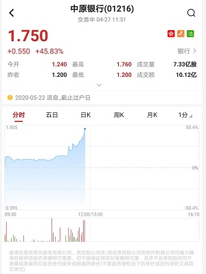 智通财经APP获悉,中原银行(01216)涨幅扩大至45%,高见1.76港元创8个月新高,截至11时51分,涨45.83%,报价1.75港元,成交额10.12亿。
