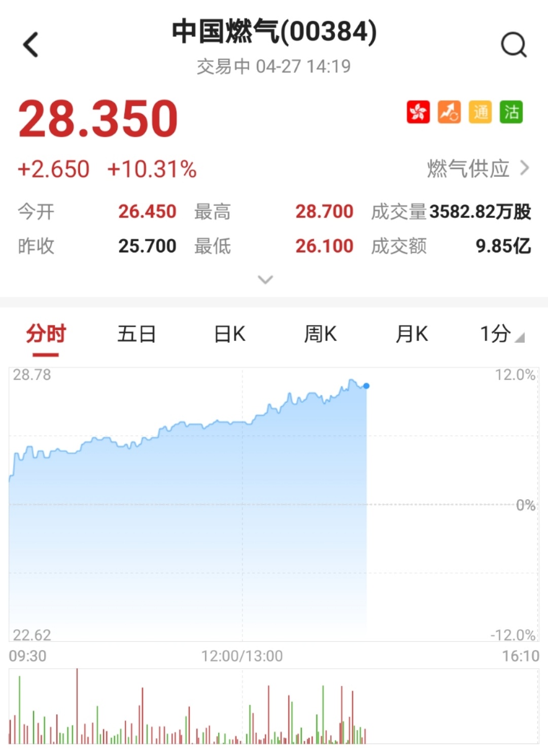 智通财经APP获悉,中国燃气(00384)获中金看高至30港元,评级“跑赢行业”,盘中一度涨超11%,突破60日均线。截至14时19分,涨10.31%,报价28.35港元,成交额9.85亿。
