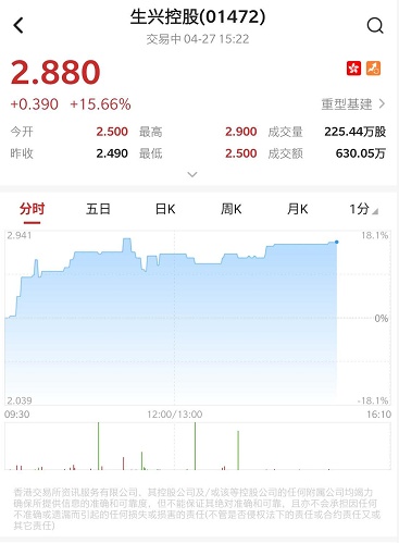 智通财经APP获悉,次新股生兴控股(01472)上市后股价持续攀升,今日盘中涨逾15%,高见2.9港元,较招股价0.5港元高近五倍。截至发稿,涨15.66%,报2.88港元,成交额630.05万港元。