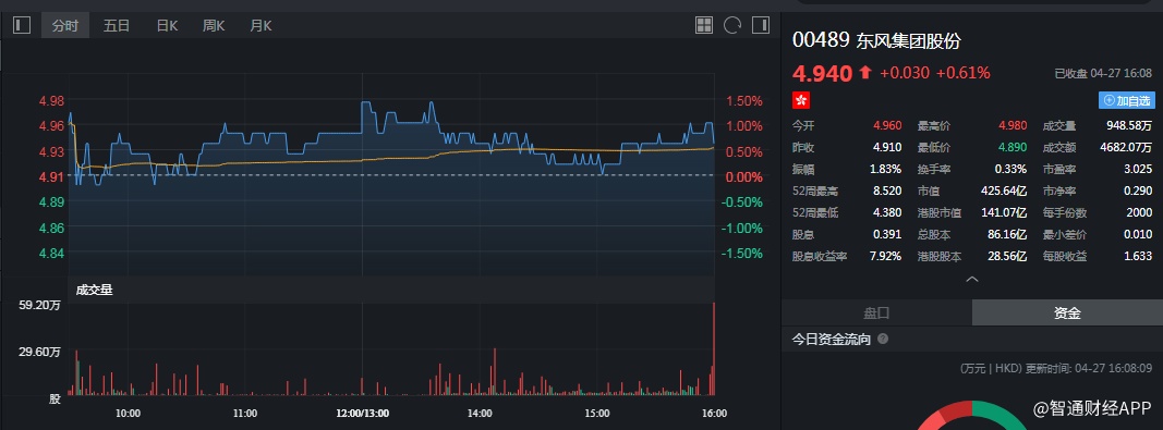 截至发稿,东风集团股份(00489)涨0.61%,报4.94港元。