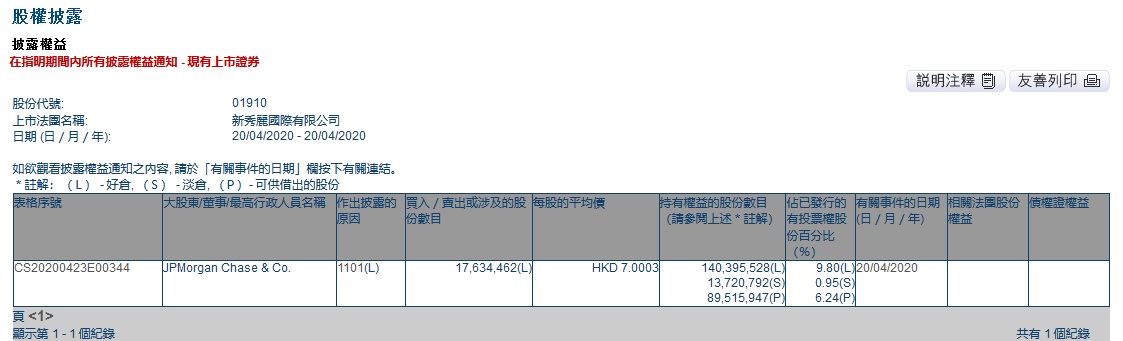 智通财经APP获悉,联交所最新资料显示,4月20日,摩根大通集团增持新秀丽(01910)1763.45万股,每股作价7.0003港元,总金额约为1.23亿港元,增持后持股数目为1.4亿股,最新持股比例为9.80%。