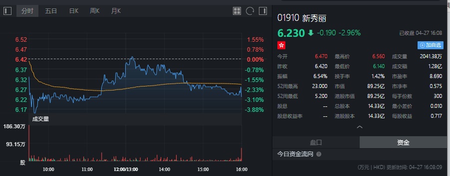 截至今日收盘,新秀丽下跌2.96%,报6.23港元。