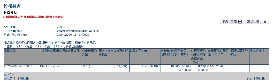 智通财经APP获悉,联交所最新资料显示,4月21日,贝莱德增持海螺水泥(00914)514.95万股,每股作价58.4693港元,总金额约为3.01亿港元,增持后持股数目1.056亿股,持股比例为8.13%。