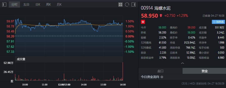 截至今日收盘,海螺水泥上涨1.29%,报58.95港元。