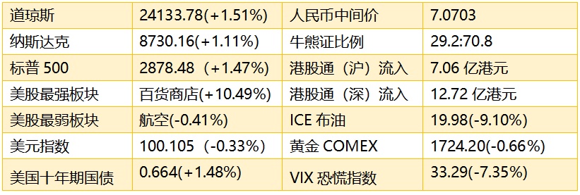 1、周一,美联储本周将进行议息,美国多个州政府计划放宽限制措施,美股周一高开高走。截至收盘,标普500指数涨41.70点,涨幅1.47%,报2878.48点;纳指涨95.60点,涨幅1.11%,报8730.16点;道指涨358.50点,涨幅1.51%,报24133.78点。港股ADR指数小幅上涨,按比例计算,收报24341点,升61.03点或0.25%。