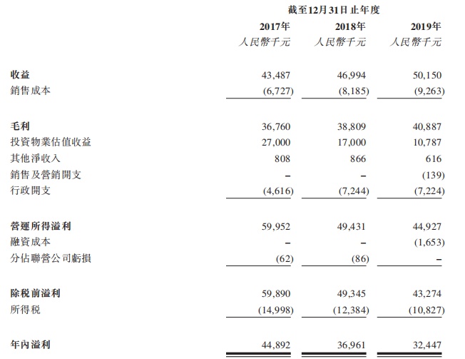 年内溢利由截至2017年12月31日止年度的约人民币4489.2万元减少约17.7%至截至2018年12月31日止年度的约人民币3696.1万元,并进一步减少约12.2%至截至2019年12月31日止年度的约人民币3244.7万元,