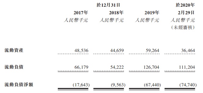 于2017年、2018年、2019年12月31日及2020年2月29日,公司分别拥有流动负债净额约人民币1764.3万元、人民币956.3万元、人民币6744万元及人民币7474万元。
