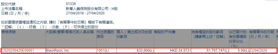 智通财经APP获悉,联交所最新资料显示,4月22日,贝莱德增持新华保险(01336)83.3万股,每股作价24.5721港元,总金额约为2046.86万港元,增持后持股数目为5170.77万股,持股比例为5%。