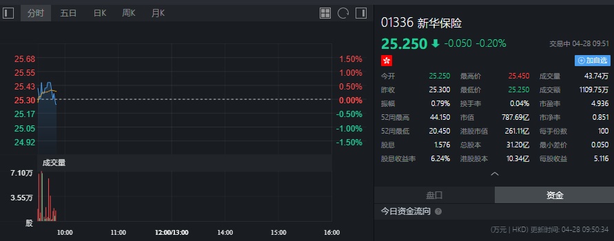 截至发稿,新华保险跌0.20%,报25.25港元。