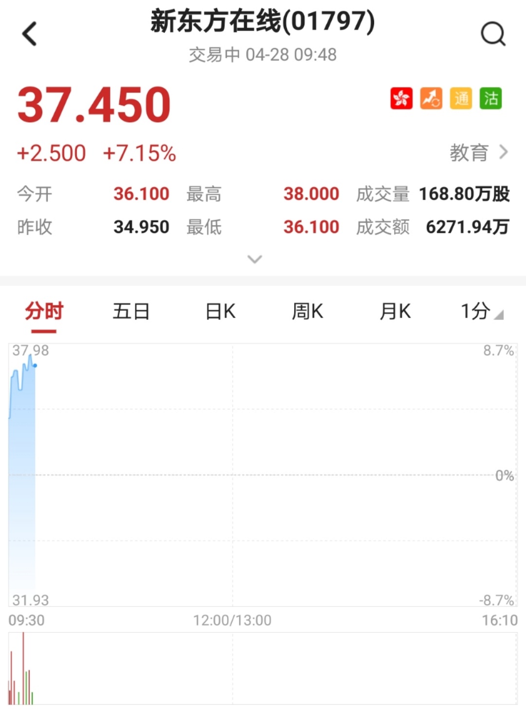 智通财经APP获悉,市场憧憬教育股业绩增长,隔夜美股跟谁学(GSX)涨超11%,新东方在线(01797)早盘急升8%,突破多条均线。截至9时48分,涨7.15%,报价37.45港元,成交额6271.94万。