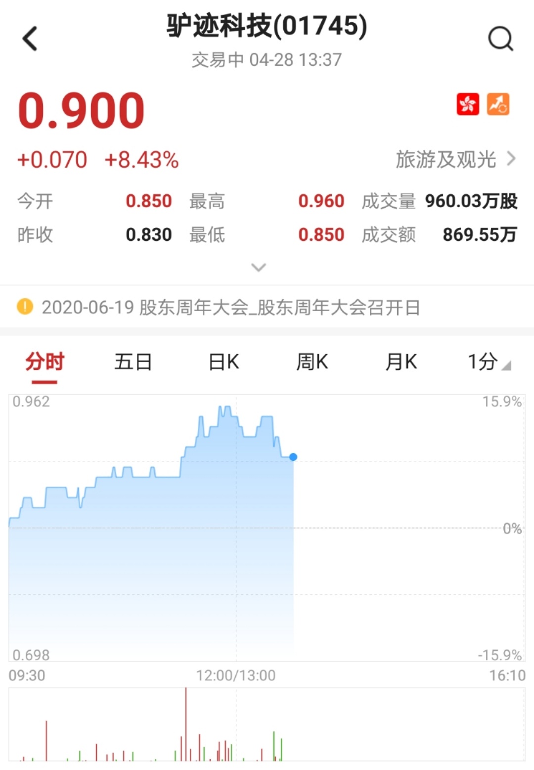该股盘中一度涨超14%,突破多条均线。截至13时37分,涨8.43%,报价0.9港元,成交额869.55万。
