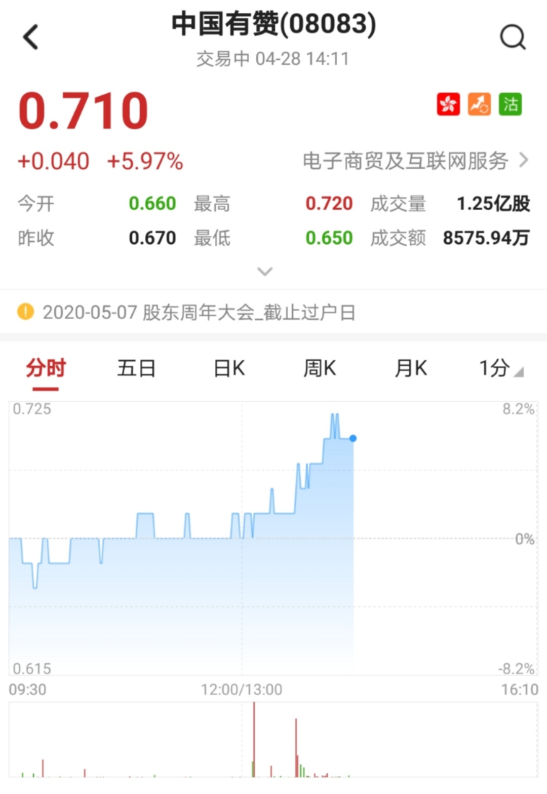 该股盘中涨超7%,突破多条均线,截至14时11分,涨5.97%,报价0.71港元,成交额8575.94万。
