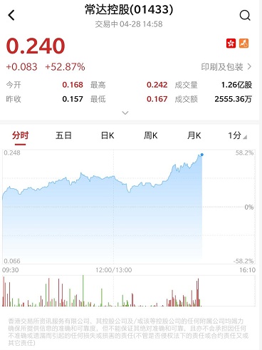 智通财经APP获悉,次新股常达控股(01433)上市首日即跌40%,此后股价持续阴跌一度腰斩。该股近两日获资金追捧,累计涨幅超90%,今日盘中高见0.242港元,将近收复发售价0.25港元。截至发稿,涨51.59%,报0.238港元,成交额2561.55万港元。