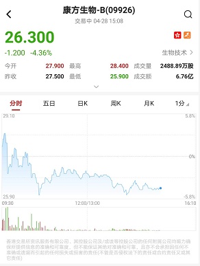 智通财经APP获悉,次新股康方生物-B(09926)高开低走,盘中放量跌超4%,截至15时08分,跌4.36%,报价26.3港元,成交额6.76亿。值得注意的是,该股盘中高见28.4港元,刷新上市新高。