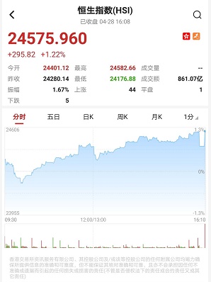 智通财经APP获悉,恒指早盘高开120.98点或0.5%,报24401.12点。截至收盘,恒生指数涨295.82点或1.22%,报24575.96点,全日成交额达861.07亿。国企指数涨1.09%,报9983.69点,红筹指数涨1.87%,报3864.1点。