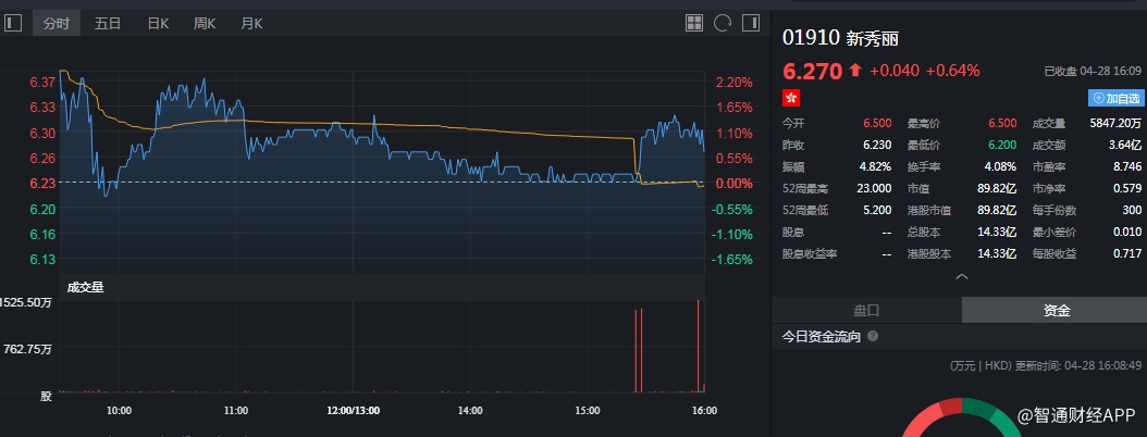 截至今日收盘,新秀丽(01910)涨0.64%,报6.27港元。