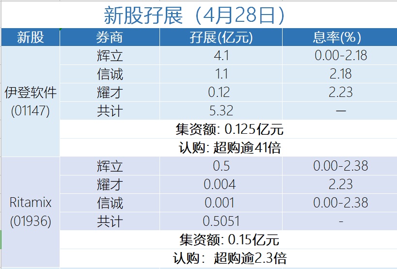 智通财经APP获悉,4月28日,伊登软件(01147)、Ritamix(01936)正在招股中,辉立、信诚、耀才共分别为其借出5.32亿港元,0.5051亿港元。其中,伊登软件超购逾41倍,Ritamix超购逾2.3倍。