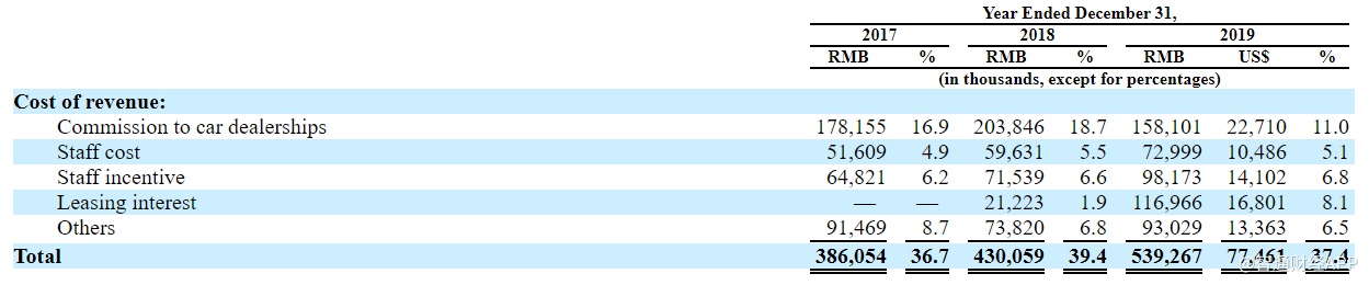 公司2019的收入成本约为5.4亿元,收入成本包括(1)支付给汽车经销商的佣金;(2)负责风险管理和不良资产管理的员工成本;(3)销售人员的奖励费;(4)租赁利息;(5)其他。下表列示了该公司各期收入成本的绝对值及占收入的百分比,值得注意的是,2019年支付给汽车经销商的佣金占灿谷收入的11%。