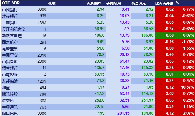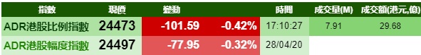 智通财经APP获悉,周二美股高开低走,拖累港股ADR指数小幅低走,按比例计算,收报24473点,跌101.59点或0.42%。