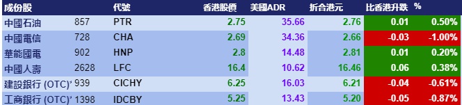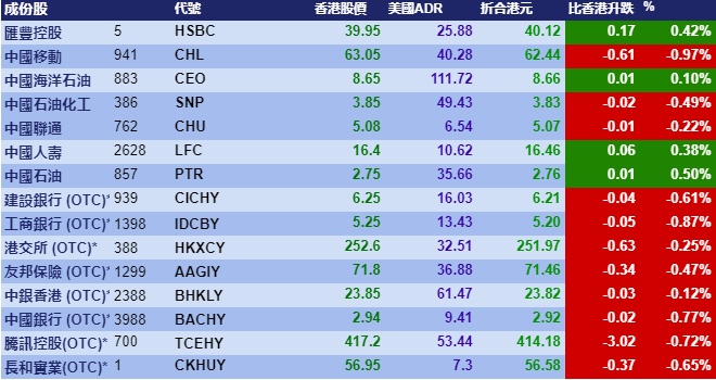 汇丰控股收报40.12元,较港收市涨0.17元;腾讯控股收报414.18元,较港收市跌3.02元。