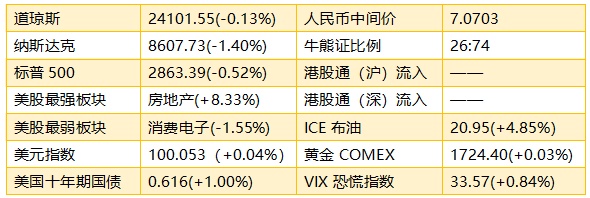 1、周二,美国部分企业盈利较预期理想,加上憧憬重启部分州经济,美股截至收盘,标普500指数跌15.10点,跌幅0.52%,报2863.39点;纳指跌122.40点,跌幅1.40%,报8607.73点;道指跌32.20点,跌幅0.13%,报24101.55点。美股高开低走,拖累港股ADR指数小幅低走,按比例计算,收报24473点,跌101.59点或0.42%。