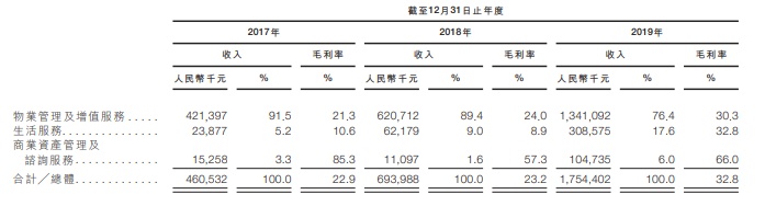于往绩记录期间,大部分该等收入来自物业管理及增值服务,于2017-2019年分别约为人民币4.21亿元、人民币6.21亿元及人民币13.41亿元,于各期间分别约占总收入的91.5%、89.4%及76.4%。