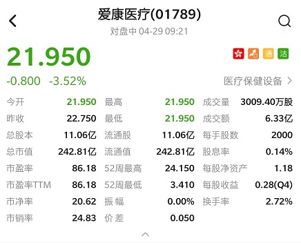 智通财经APP获悉,爱康医疗(01789)发布公告,控股股东喜马拉亚有限公司以每股21.04港元的价格配售3000万股股份。涉资6.31亿港元。该股市前现多宗大手成交,或为该配售上板。截至发稿,跌3.52%,报21.95港元,成交额6.33亿港元。
