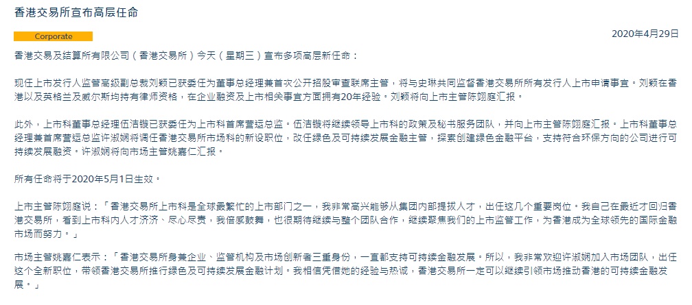 智通财经APP获悉,今日(4月29日),据港交所(00388)官网公告,香港交易所任命刘颖担任首次公开招股审查联席主管,任命将于5月1日生效。
