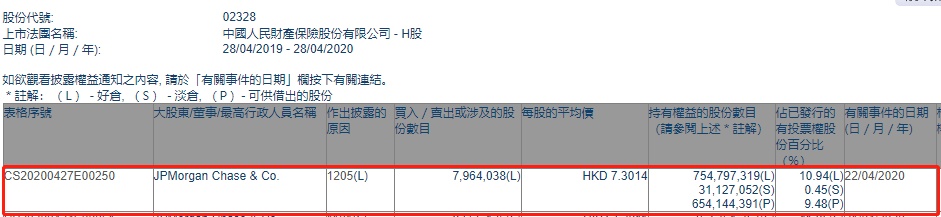 智通财经APP获悉,联交所最新资料显示,4月22日,摩根大通减持中国财险(02328)796.4038万股,每股作价7.3014港元,总金额约为5814.86万港元。减持后最新持股数目约为7.55亿股,最新持股比例为10.94%。