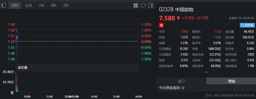 截至发稿,中国财险涨0.13%,报7.58港元。