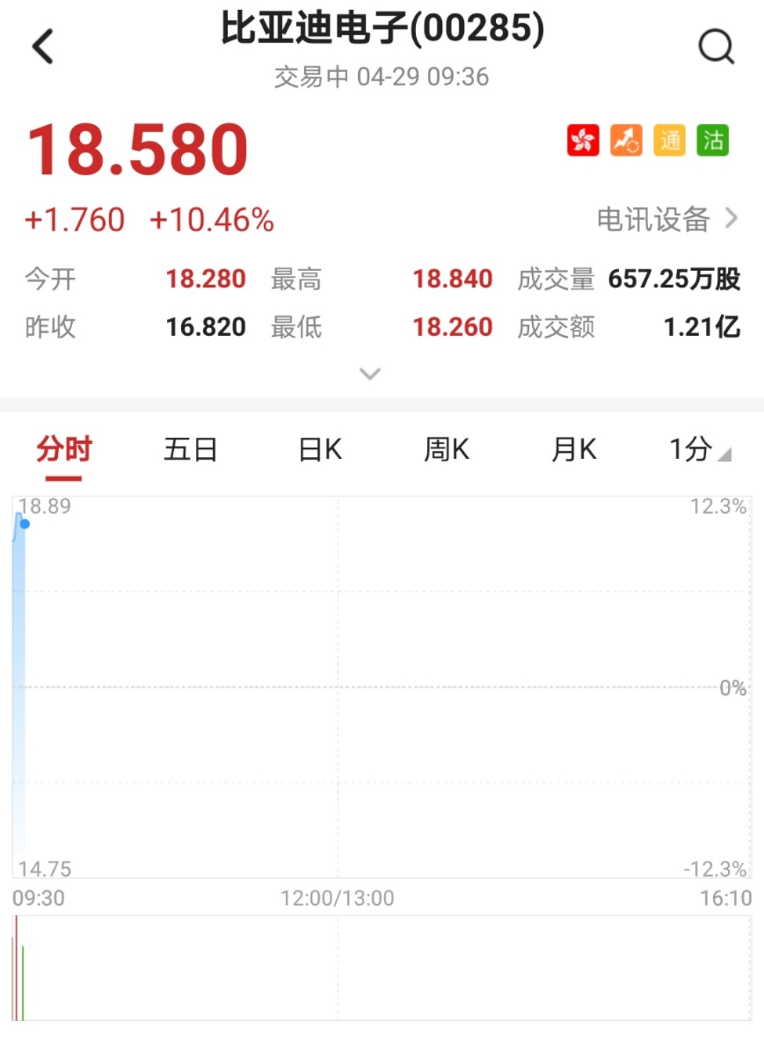 智通财经APP获悉,比亚迪电子(00285)首季度净利同比增69.44%至6.57亿人民币,并预计上半年净利将同比增不少于280%,早盘高开股价大幅高开,创逾三个月新高。截至9时36分,涨10.46%%,报价18.58港元,成交额1.21亿。