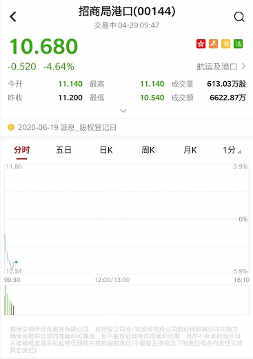 智通财经APP获悉,昨日市场传闻称,招商局集团考虑将招商局港口(00144)私有化。招商局港口回复,所有的消息都会通过港交所公布。该股今日早盘跌超5%,截至发稿,跌5.36%,报10.6港元,成交额7112.3万港元。