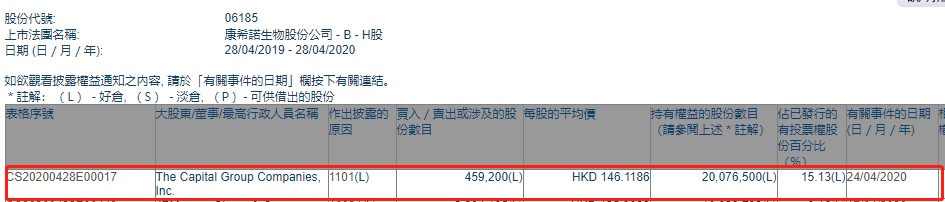 智通财经APP获悉,联交所最新资料显示,4月24日,美国资本集团增持康希诺生物(06185)45.92万股,每股作价146.1186港元,总金额约为6709.77万港元。增持后最新持股数目约为2007.65万股,最新持股比例为15.13%。