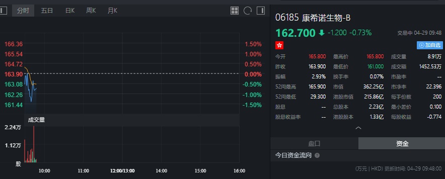 截至发稿,康希诺生物跌0.73%,报162.70港元。