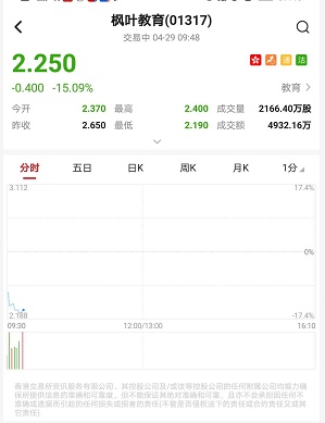 智通财经APP获悉,枫叶教育(01317)中期经调整纯利同比下降9.6%至2.75亿元,不及市场预期,早盘大幅低开,截至9时48分,跌15.09%,报价2.25港元,成交额4932.16万。