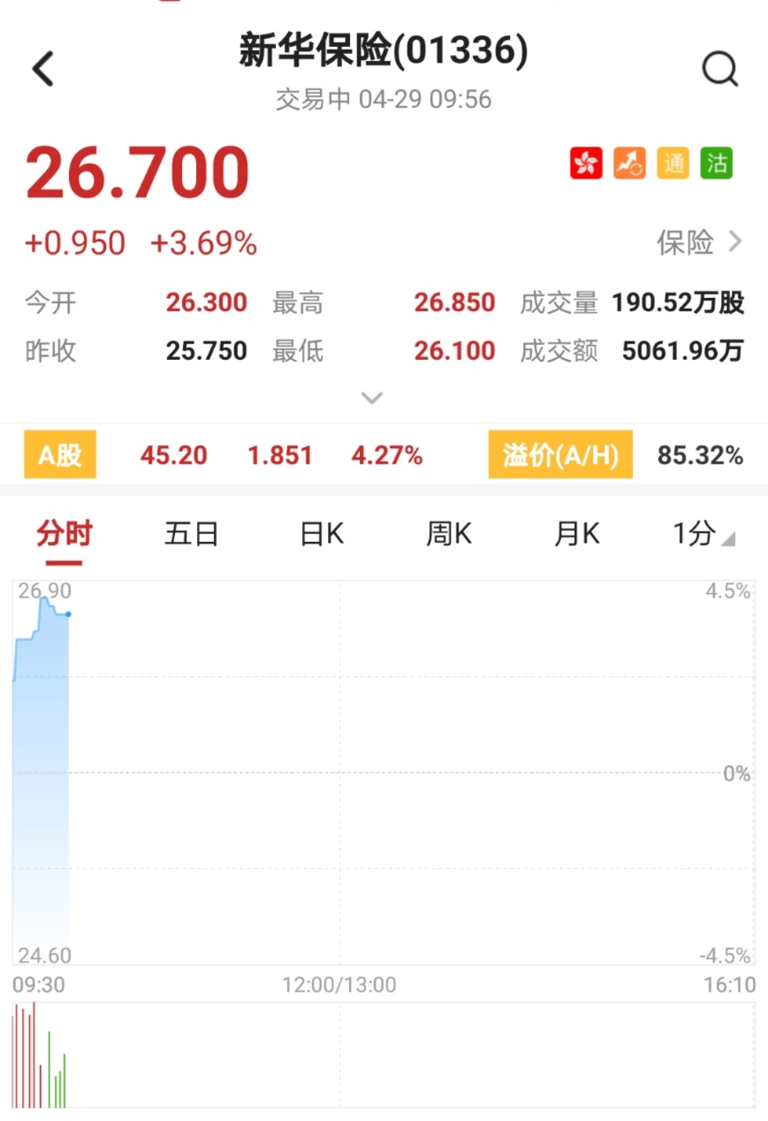 智通财经APP获悉,新华保险(01336)首季度净利润同比增长37.7%至46.35亿元,盘中涨超4%,突破多条均线,创一个月新高。截至9时56分,涨3.69%,报价26.7港元,成交额5061.96万。