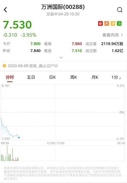 智通财经APP获悉,万洲国际(00288)发布一季度业绩,按生物公允价值调整后的业绩,期内收入为62.82亿美元,同比增长18.9%。公司拥有人应占利润为2.81亿美元,同比减少19.25%。此外,据媒体报道,美国加工厂停工影响上游,养殖场或销毁多余猪只。截至发稿,万洲国际跌4.08%,报7.52港元,成交额1.59亿港元。