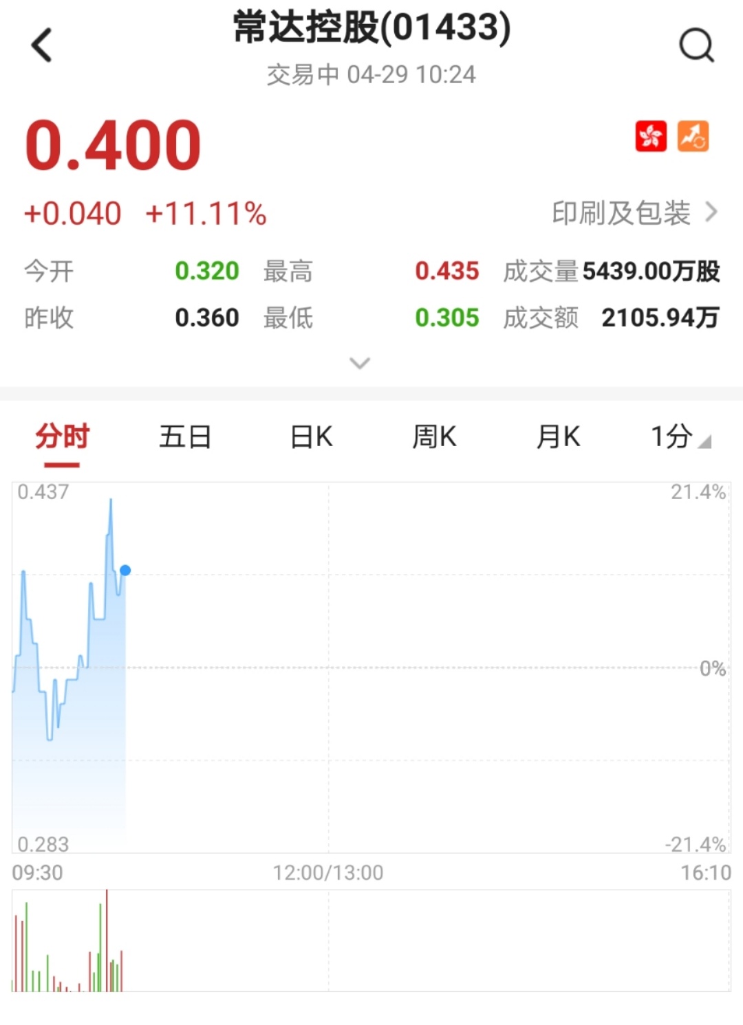智通财经APP获悉,次新股常达控股(01433)延续涨势,早盘飙涨20%创新高,连续三个交易日累计涨幅达225%,截至10时24分,涨11.11%,报价0.4港元,成交额2105.94万。
