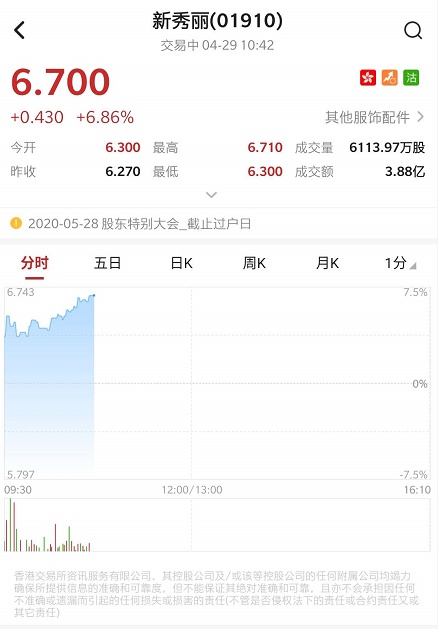 智通财经APP获悉,根据联交所最新权益披露资料显示,2020年4月23日,新秀丽(01910)获美国资本集团增持1528.5万股,在场内以每股均价6.5241港元,涉资约9972.09万港元。截至发稿,新秀丽涨6.7%,报6.69港元,成交额3.91亿港元。