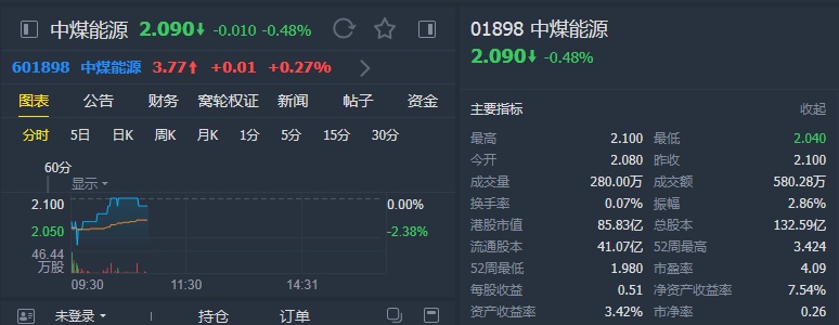 瑞信称,按照中国会计准则,中煤能源首季净利润同比跌58%至6.48亿元人民币,逊于该行及市场预期,盈利下跌主要由于煤炭及煤化工产品价格下降。该行下调对其盈利预测,但基于估值吸引,维持其“跑赢大市”评级,另预计当进入夏天的需求旺季,煤炭价格将上升。