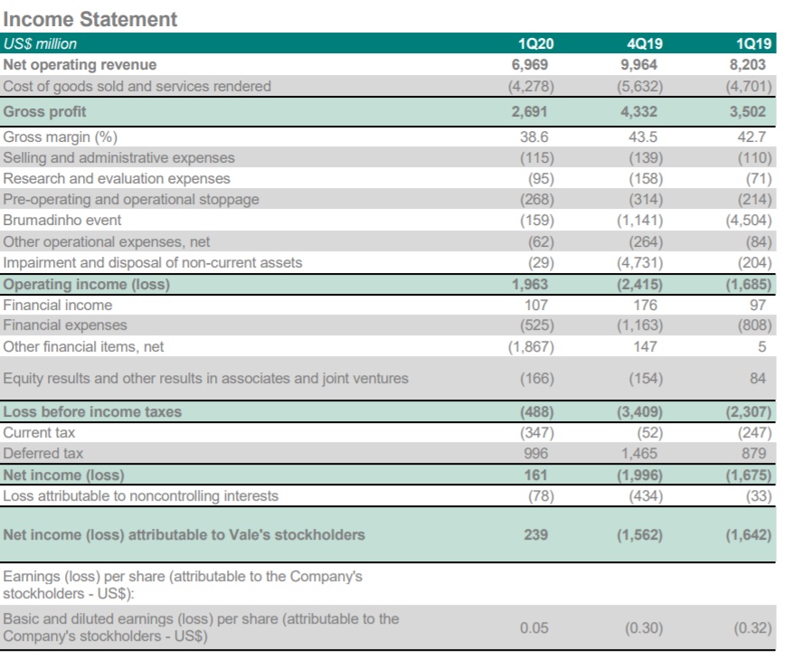 根据财报,2020年第一季度,淡水河谷净营收为69.69亿美元,同比下滑15%。