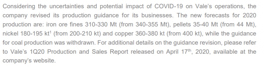 考虑到卫生事件对淡水河谷业务的不确定性和潜在影响,该公司修改了对各项业务的生产指引。公司对新的2020年产量预测如下: