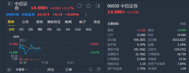 智通财经APP获悉,瑞信发表研究报告,调低中信证券(06030)目标价1.4%,由22.1港元下调至21.8港元,维持“跑赢大市”评级。