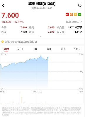 智通财经APP获悉,海丰国际(01308)午间披露一季报,收入同比增0.9%至3.64亿美元,午后一度涨近7%,截至13时45分,涨5.85%,报价7.6港元,成交额1.11亿。
