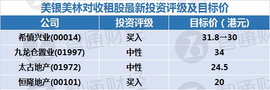 美银美林对地产股及收租股最新投资评级及目标价(表)
