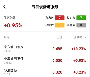 智通财经APP获悉,NYMEX期油大幅反弹,港股油气设备板块集体走强,安东油田服务(03337)暂领涨板块,截至14时23分,安东油田服务涨10.23%,报价0.485港元,中海油田服务(02883)涨5.95%,华油能源(01251)涨3.23%。