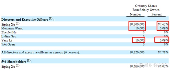 首席财务官王梦楠和董事李洋各自持有10,000股普通股,持股比例同为0.09%。