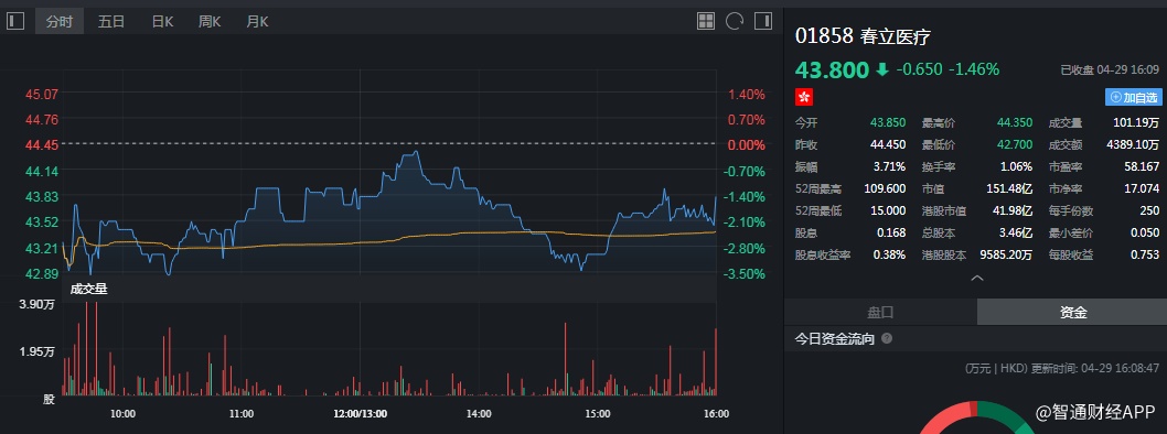 截至今日收盘,春立医疗(01858)跌1.46%,报43.80港元。