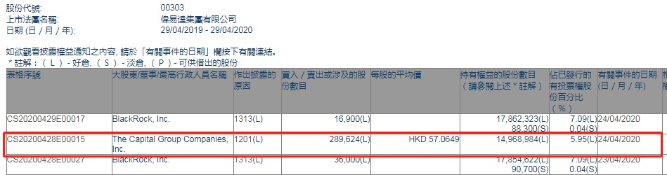 智通财经APP获悉,联交所最新资料显示,4月24日,美国资本集团减持伟易达集团(00303)28.96万股,每股作价57.0649港元,总金额约为1652.60万港元。减持后最新持股数目约为1496.9万股,最新持股比例为5.95%。